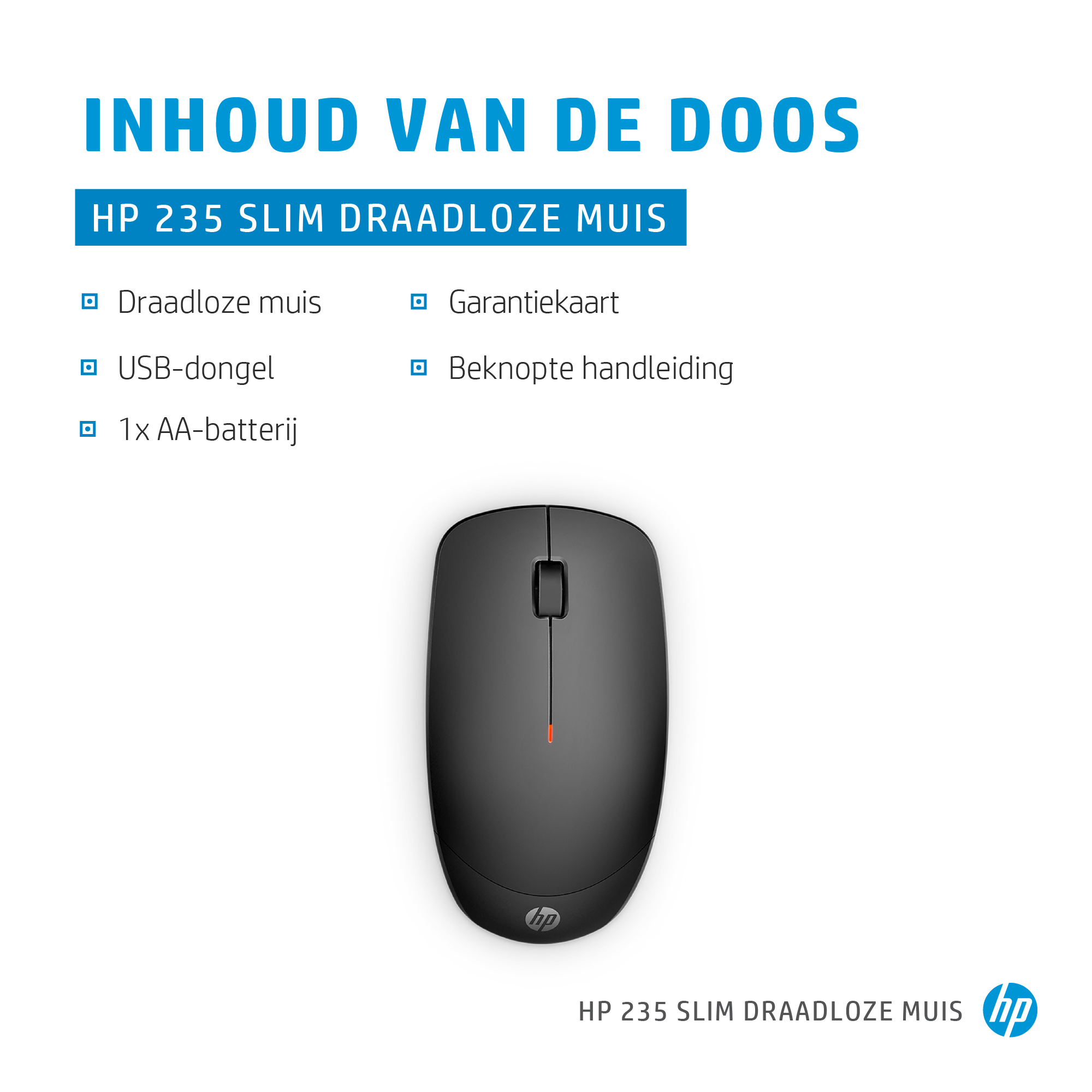 Voer elke taak uit met deze duurzame muis die is ontwikkeld voor comfort. De HP 235 slanke draadloze muis is ontworpen en getest om langdurig comfort te bieden en voldoet met gemak aan beide eisen.