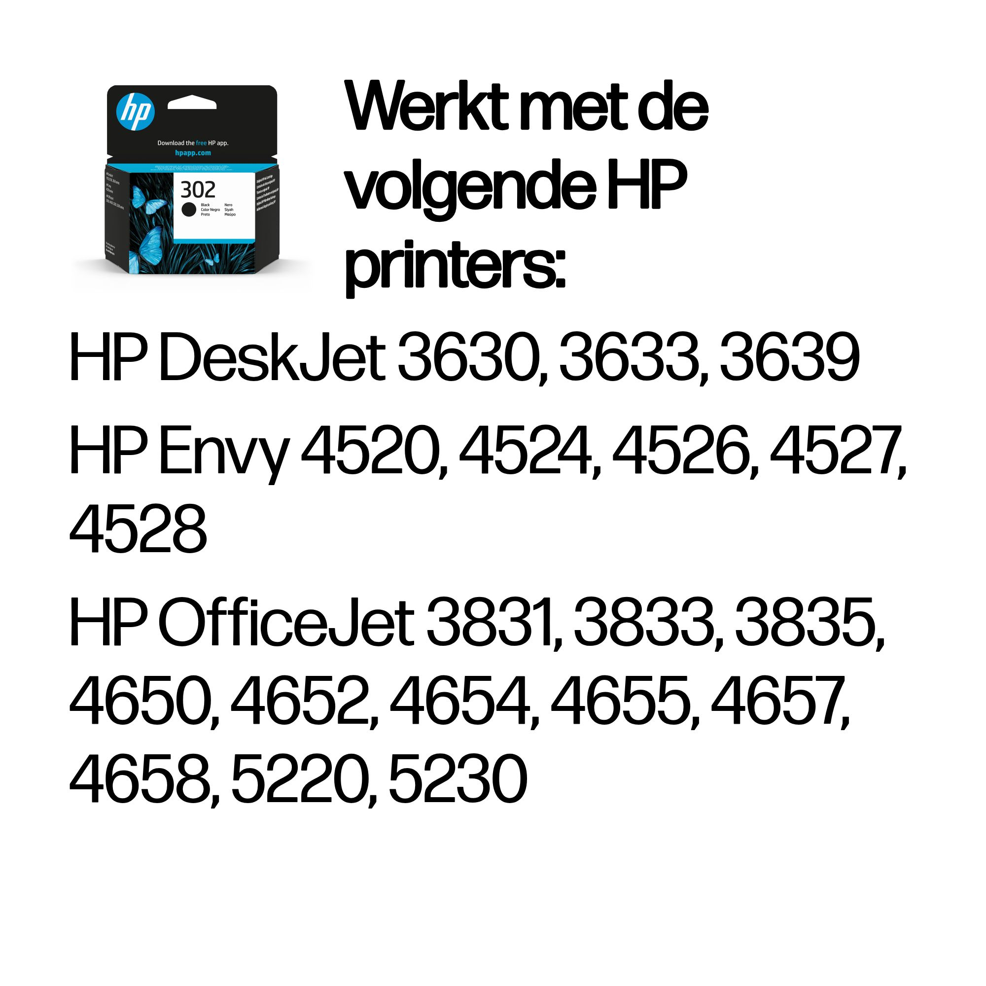 | Compatibiliteit | HP 302 inktcartridges werken met: HP DeskJet 3630, 3633, 3639 HP Envy 4520, 4524, 4526, 4527, 4528 HP OfficeJet 3831, 3833, 3835, 4650, 4652, 4654, 4655, 4657, 4658, 5220, 5230 |