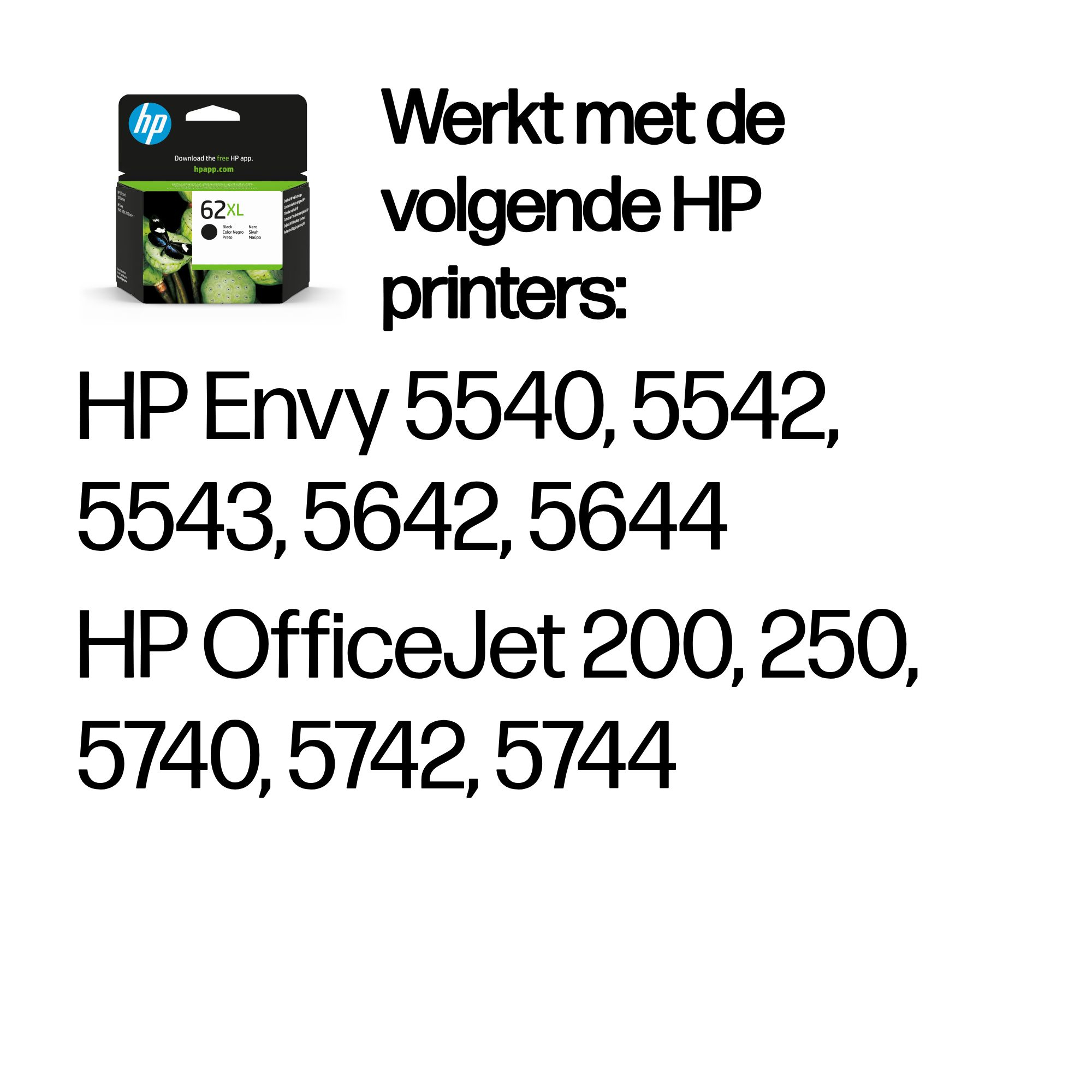 | Compatibiliteit | HP 62 inktcartridges werken met: HP Envy 5540, 5542, 5543, 5642, 5644 HP OfficeJet 200, 250, 5740, 5742, 5744 |