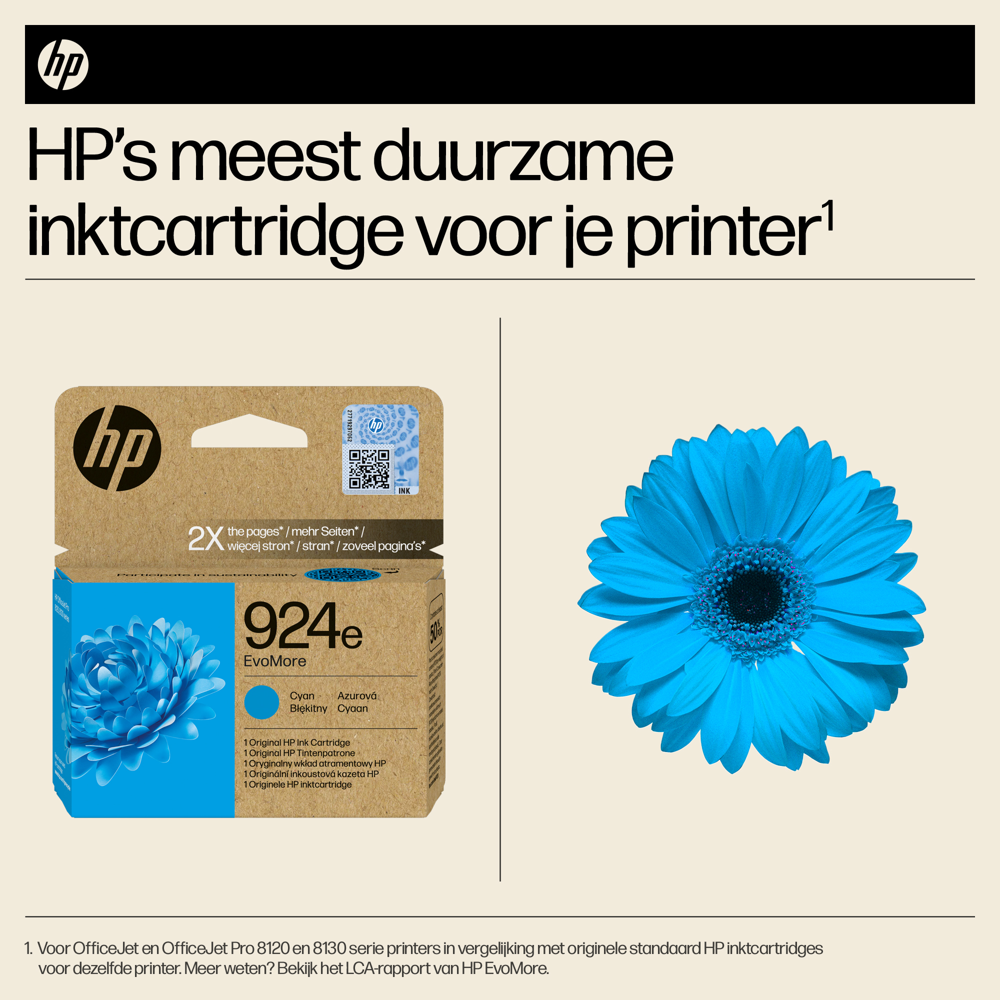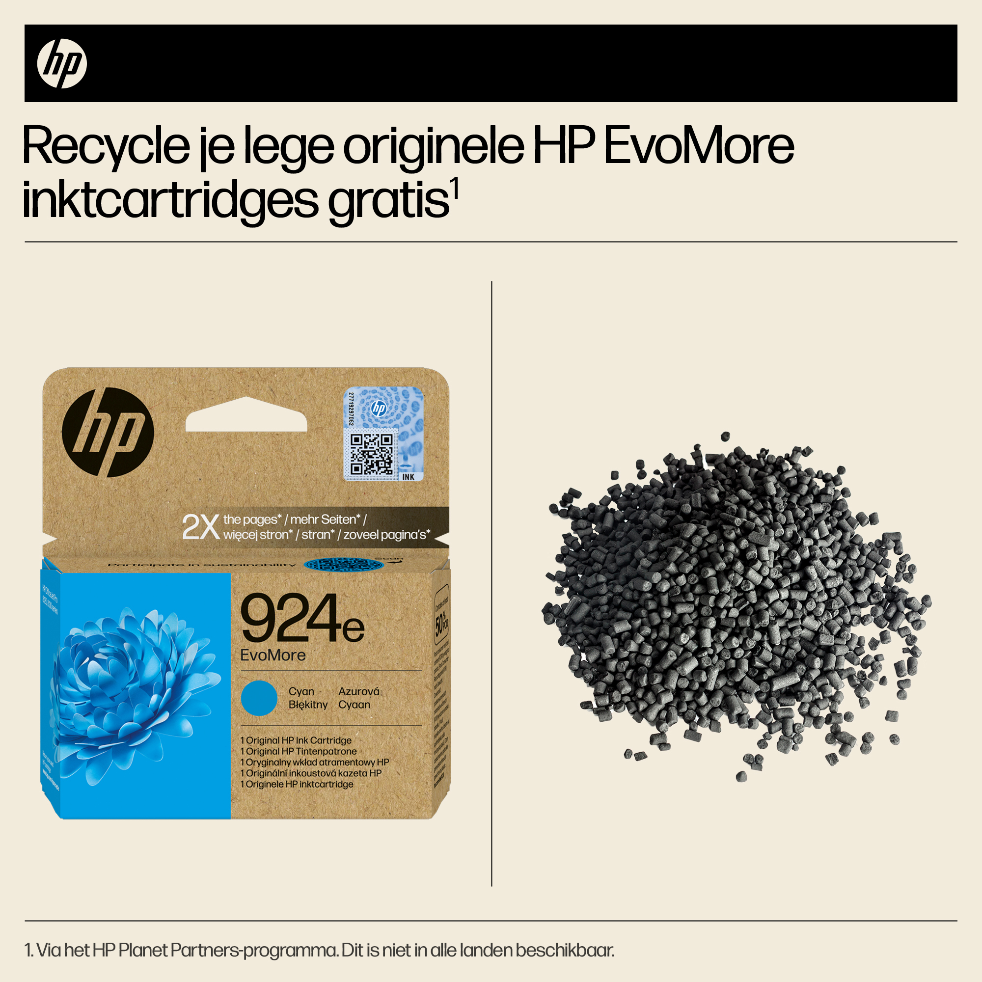 Originele HP EvoMore-inktcartridges, die ontworpen zijn om twee keer zoveel pagina's te printen als standaardcartridges,[3] zorgen voor een lagere CO₂-uitstoot[2] en kunnen eenvoudig worden gerecycled[4]. Hierbij komen hoge prestaties, kwaliteit en duurzaamheidskenmerken samen.