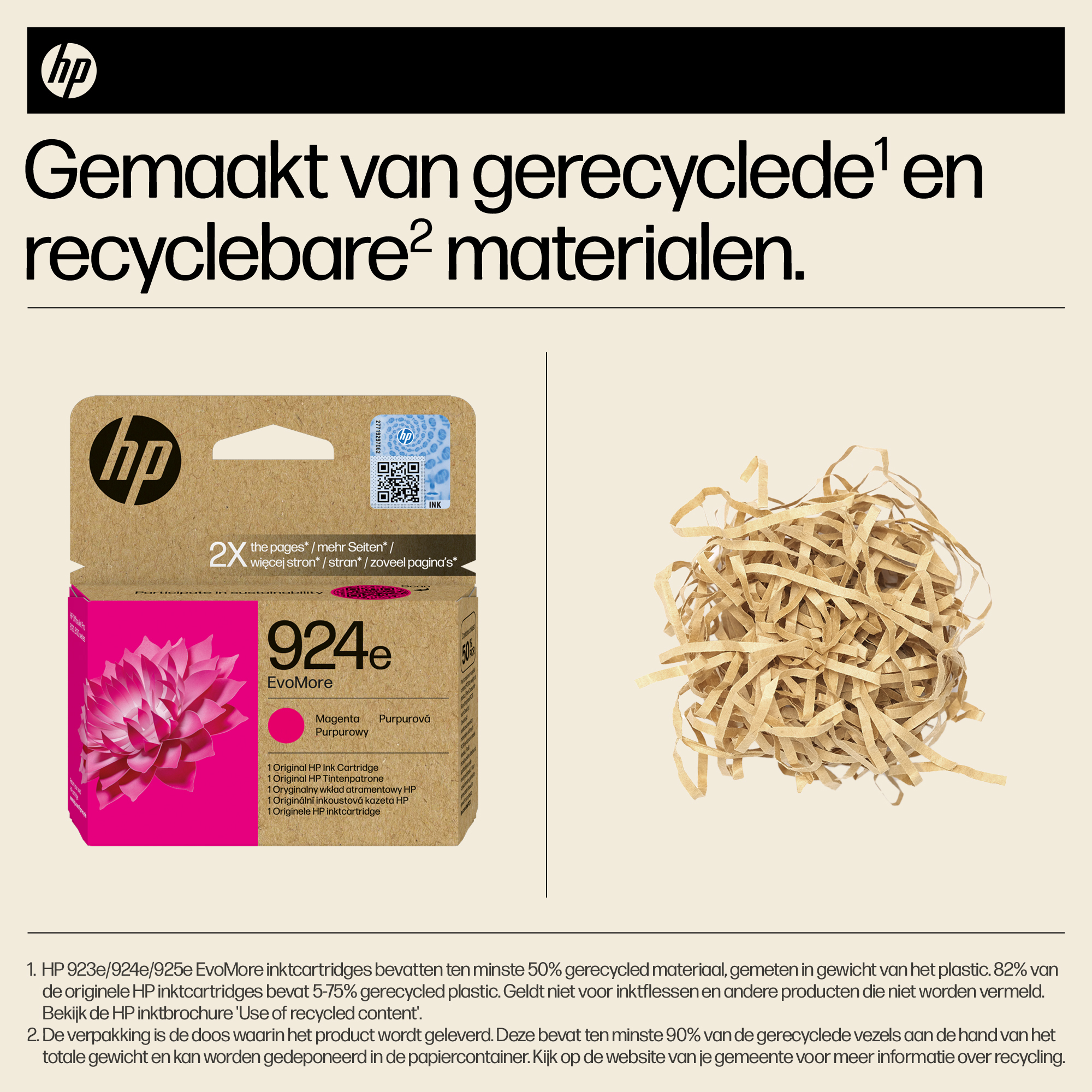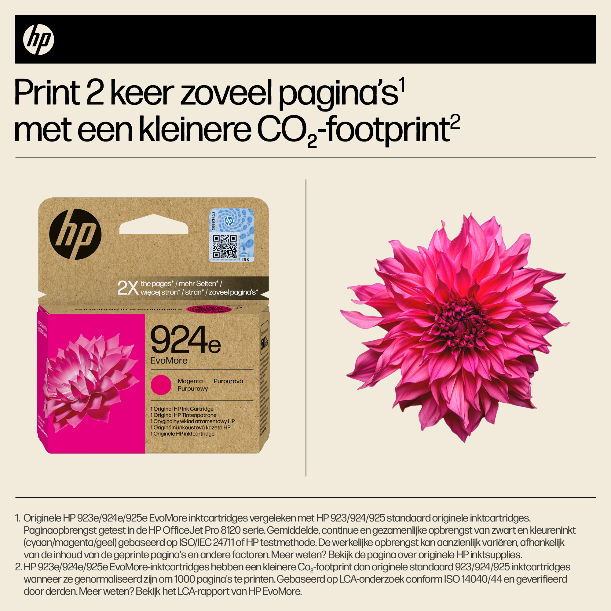 Originele HP EvoMore-inktcartridges, die ontworpen zijn om twee keer zoveel pagina's te printen als standaardcartridges,[3] zorgen voor een lagere CO₂-uitstoot[2] en kunnen eenvoudig worden gerecycled[4]. Hierbij komen hoge prestaties, kwaliteit en duurzaamheidskenmerken samen.