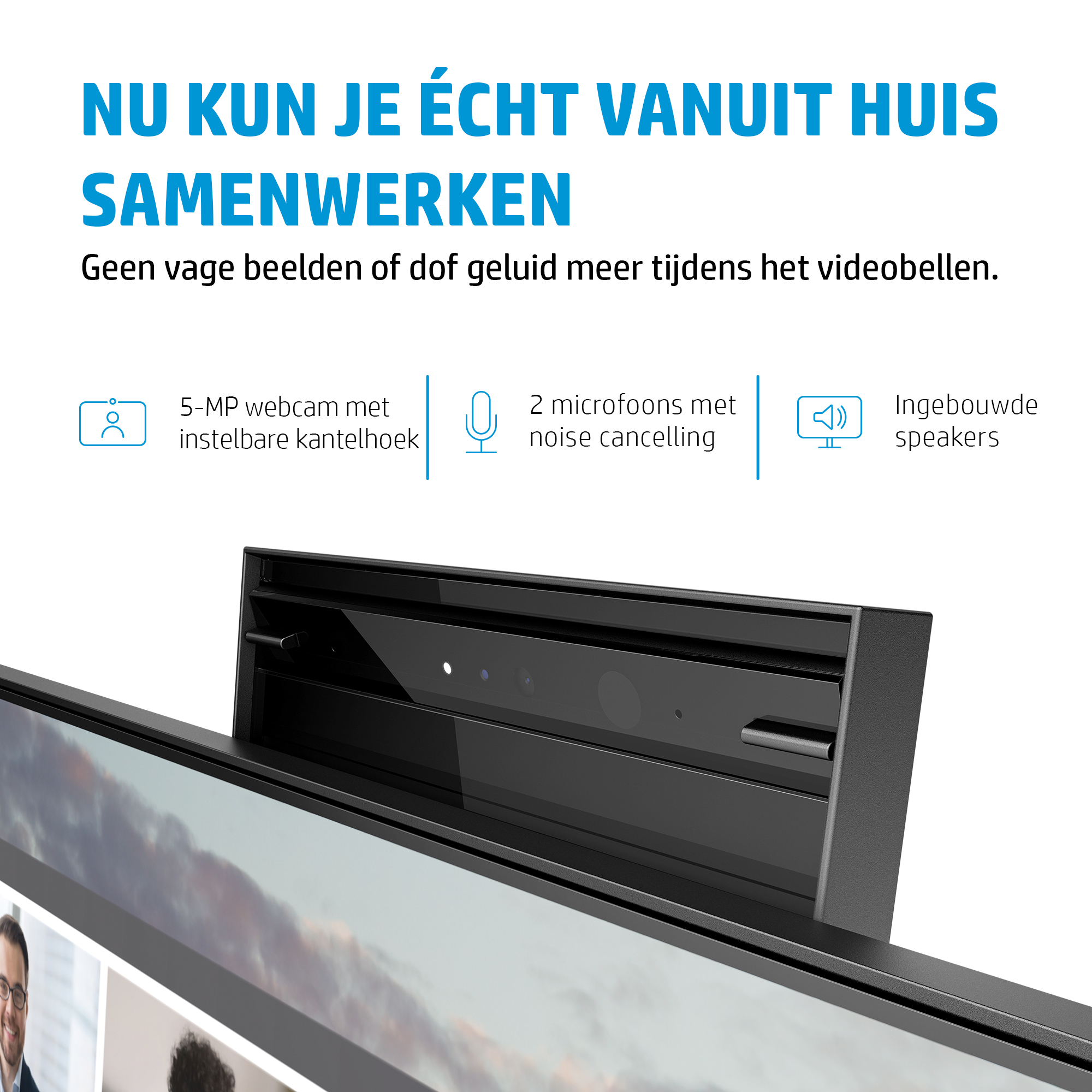 Neem afscheid van vage beelden en dof geluid tijdens videogesprekken. Profiteer van een scherp beeld met een geïntegreerde webcam van 5 megapixel die je 25 graden kunt kantelen voor de perfecte hoek. Hij heeft een pop-upfunctie voor privacy, een verbeterde kleurensensor en biedt ondersteuning voor Windows Hello™. De ingebouwde speakers en de twee microfoons met echo-onderdrukking produceren een vol, helder geluid.