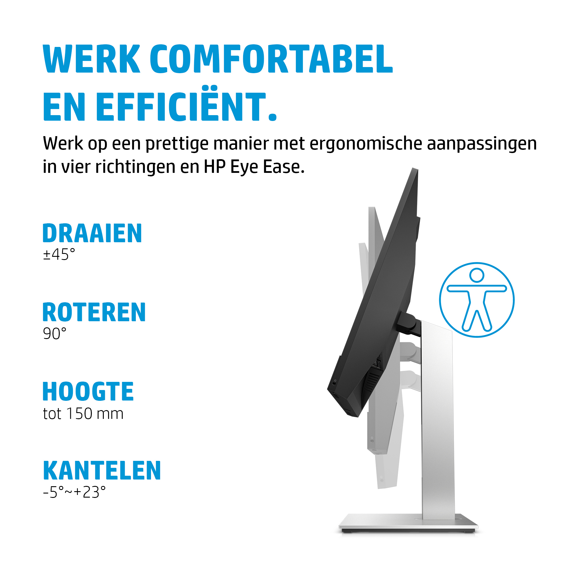 Werk zonder inspanning met op vier manieren in te stellen ergonomie en bekijk je werk in een prettige houding op een FHD-scherm van 60,45 cm (23,8 inch) dat het blauwe licht filtert met HP Eye Ease.