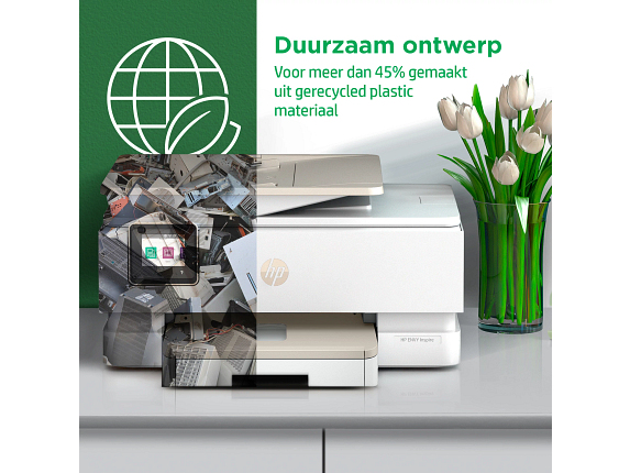 Duurzame technologieën en materialen | 45% gerecycled plastic uit consumentenproducten; Recyclebaar via HP Planet Partners; HP+ afdrukken die helpen ontbossing tegen te gaan |