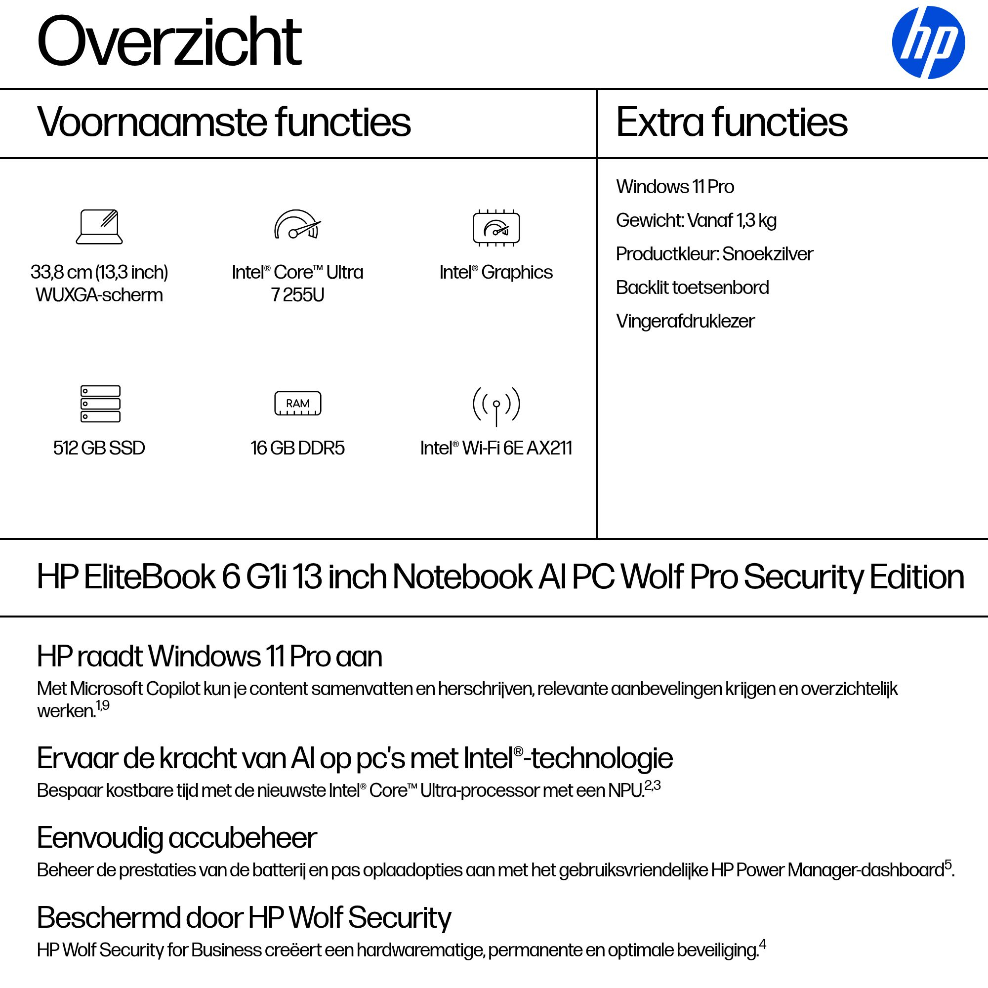 HP EliteBook 6 G1i Intel Core Ultra 7 255U Laptop 33,8 cm (13.3") WUXGA 16 GB DDR5-SDRAM 512 GB SSD Wi-Fi 6E (802.11ax) Windows 11 Pro AI PC Zilver