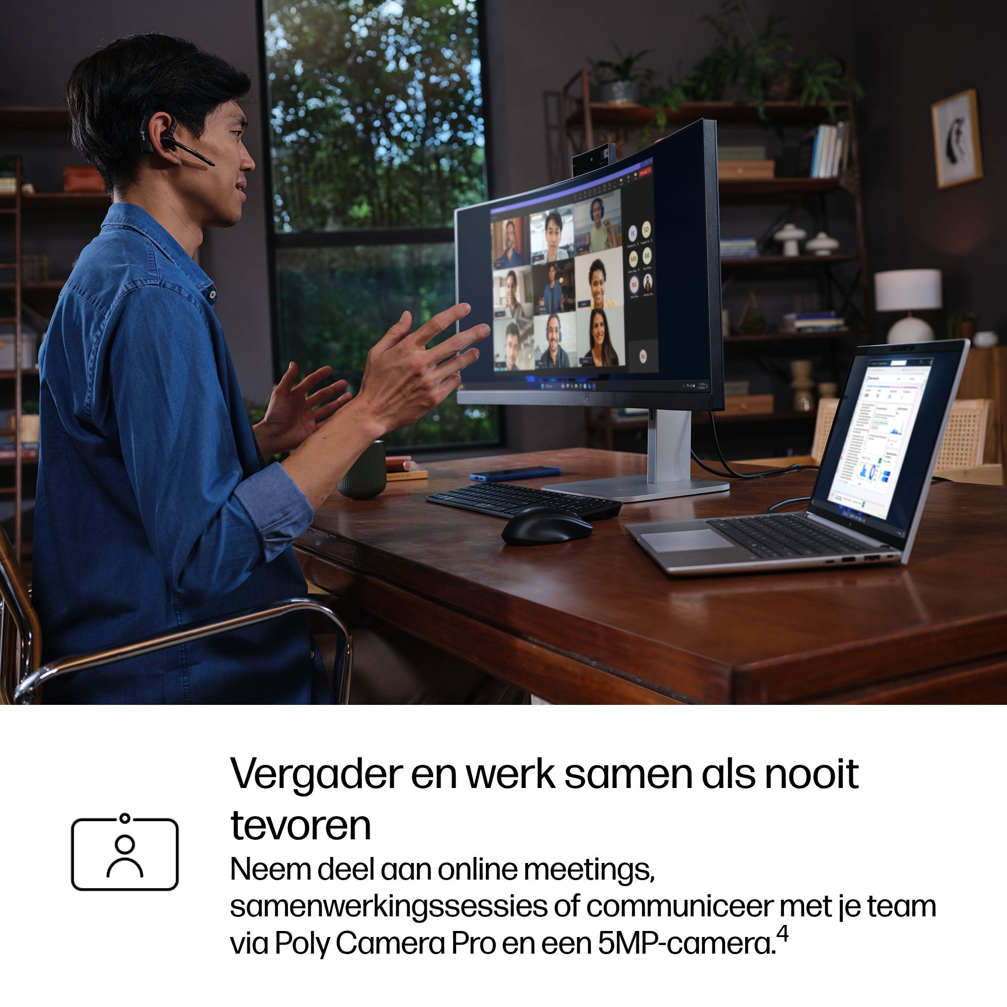 Zie er tijdens elk videogesprek altijd op je best uit en werk energiezuinig. Met Poly Camera Pro kun je zowel de interne als externe camera bedienen. Dankzij de NPU verbruiken Auto Framing, Spotlight, Background Blur en virtuele achtergronden minder energie.[10]