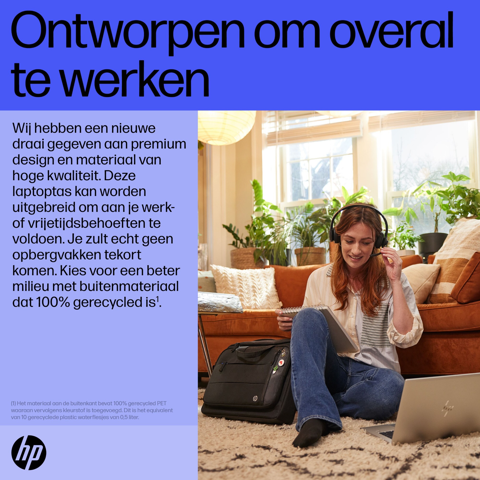 We hebben een geheel nieuwe draai gegeven aan premium design en hoogwaardige materialen. Deze laptoptas is vervaardigd met een functionele stijl en kun je uitbreiden om aan jouw werk- of privébehoeften te voldoen. Niet dat je zonder vakken komt te zitten om al je apparaten in op te bergen. Hou je belangrijke zaken dicht bij je en zet je in voor de aarde met het materiaal aan de buitenkant dat 100% gerecycled plastic bevat[1].