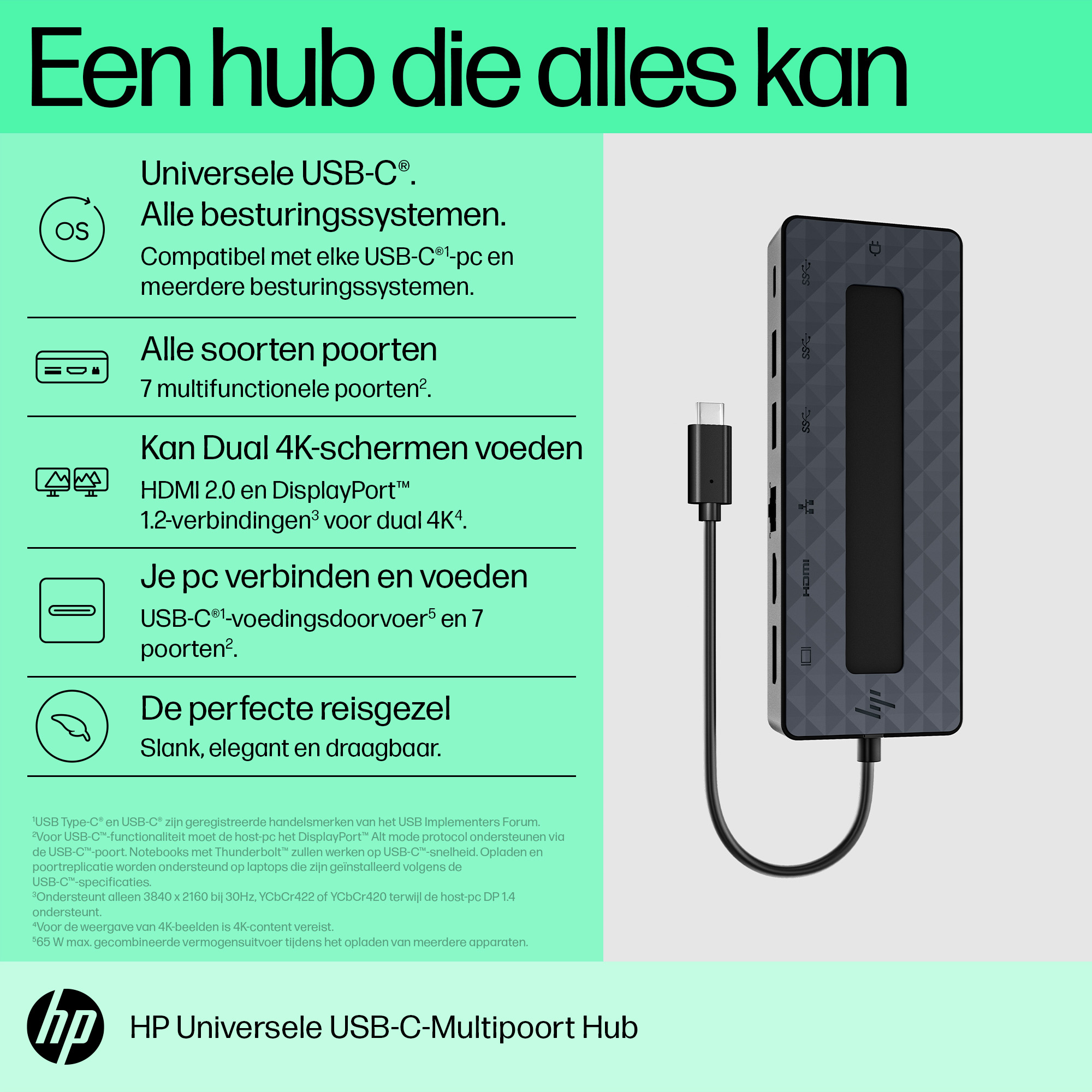Profiteer van de nieuwe mogelijkheden met de HP Universal USB-C Multiport hub, die nu elke met USB-C[1] compatibele pc ondersteunt. 7 poorten, 1 stroom- en datadoorvoerkabel, en veel randapparatuur om via plug-en-play aan te sluiten. Hij ondersteunt ook twee 4K-beeldschermen[2] via HDMI 2.0 en 1 DisplayPort™ 1.2. Deze hub is alles wat je nodig hebt om verbonden te blijven.
