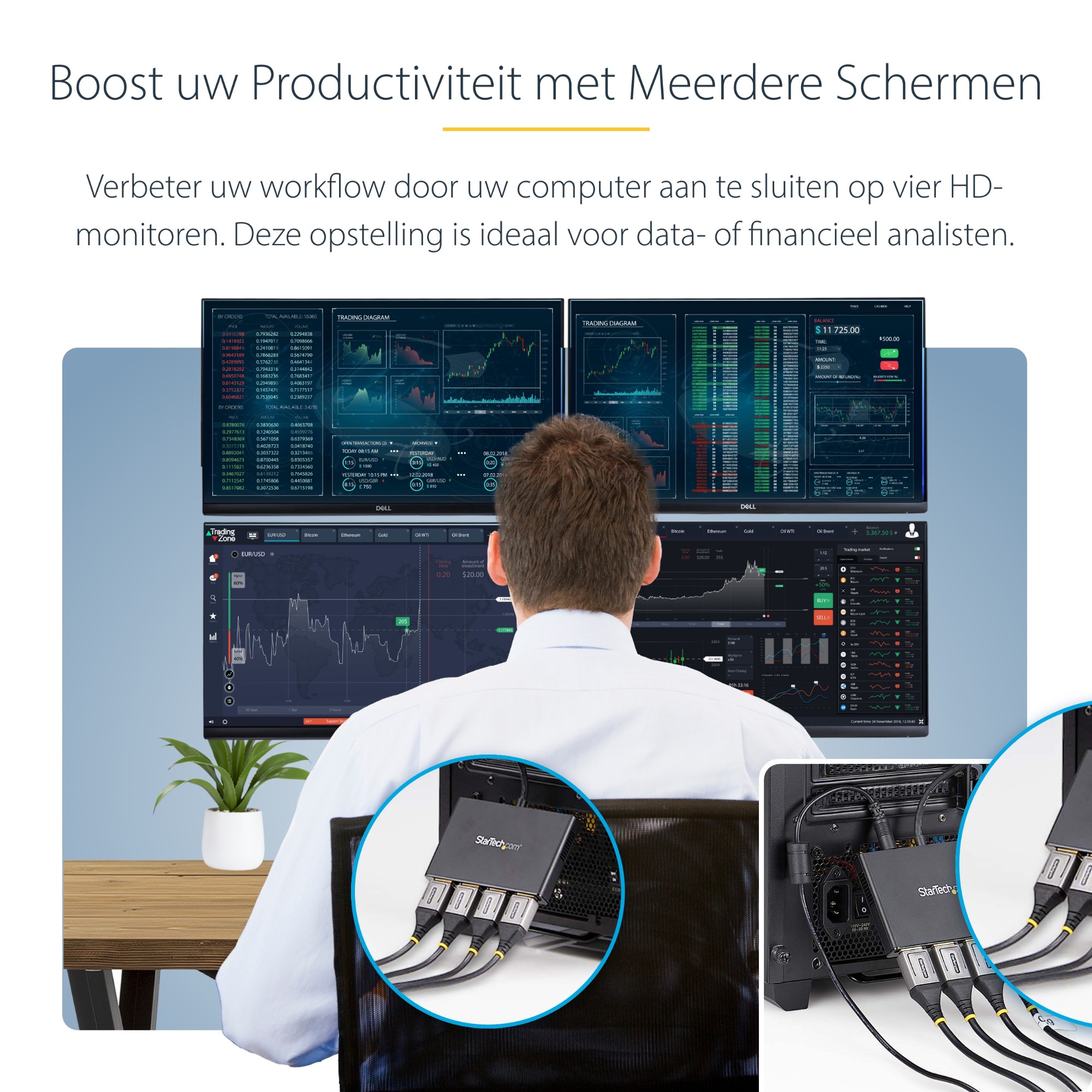 De nieuwste computergeneraties zijn mobieler dan ooit, wat vaak betekent dat u minder video-uitgangen en kleinere geïntegreerde schermen heeft. Deze MST hub lost deze twee problemen op doordat u vier onafhankelijke schermen op uw computer kunt aansluiten, waardoor multitasking wordt vergemakkelijkt.